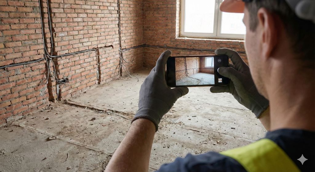 Kleb den Sticker ans Fenster, scanne mit dem Handy und sichere alle Leitungen, Rohre und Einbauten als Fotos – ohne App und ohne Login.