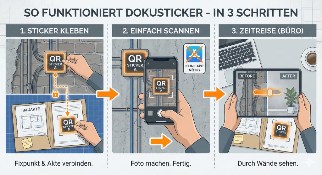 Auf der Baustelle verschwindet alles hinter Putz, Fliesen und Dämmung. Mit DOKUSTICKER bekommt jede wichtige Stelle im Haus einen eigenen QR-Sticker – und damit eine eigene Fotostrecke. So weißt du auch Jahre später noch, wo Kabel, Rohre und Dosen wirklich liegen.